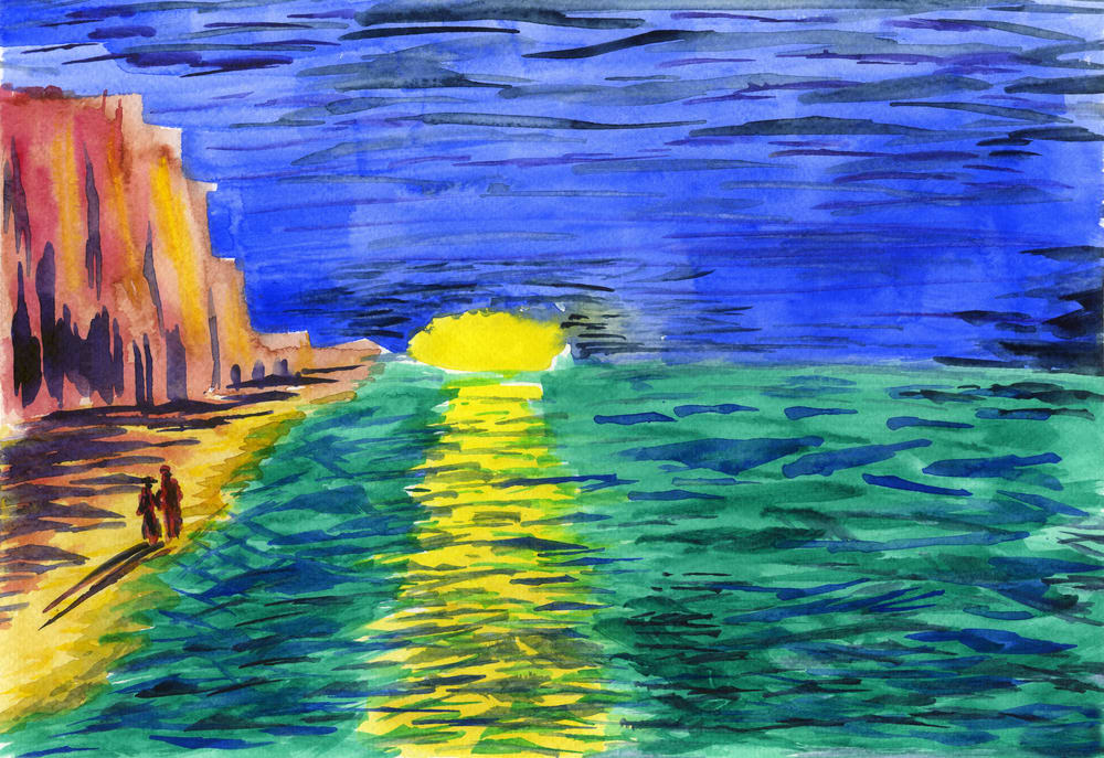 Couple walking along the sea beach. Sunset time, the sun is almost gone. Watercolor painting.