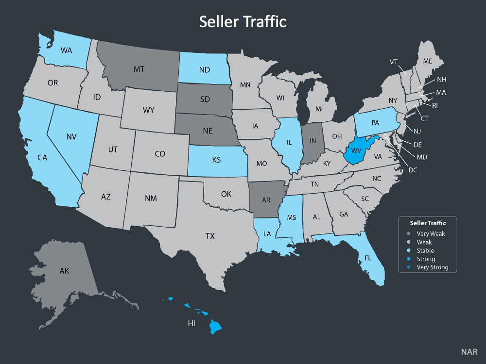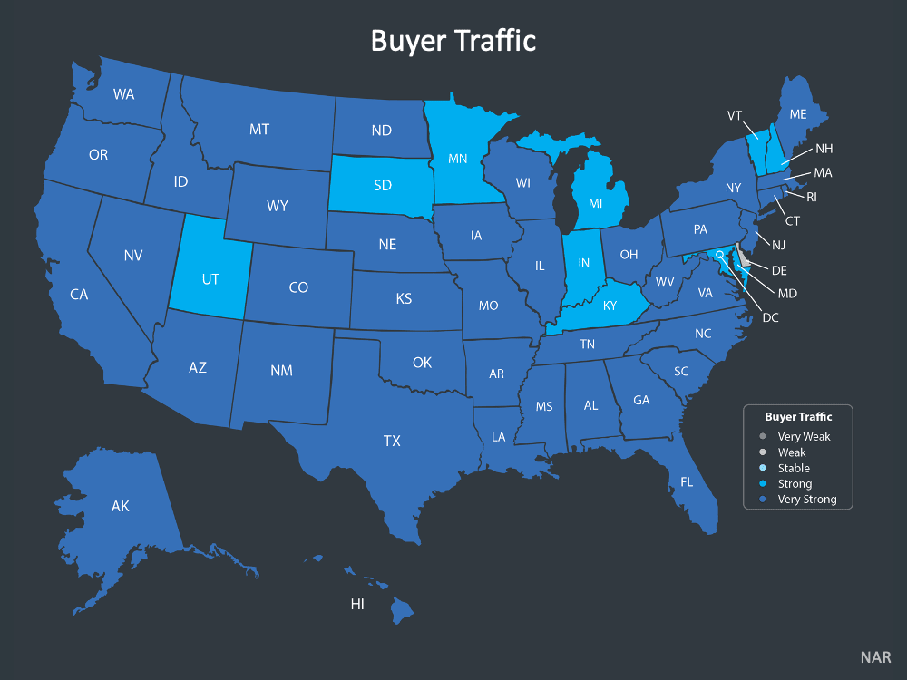 Now let’s look at buyer traffic. In nearly every single state you have ‘very strong’ buyer traffic. Multiple offers are common place and most homes that reach the market are sold.
