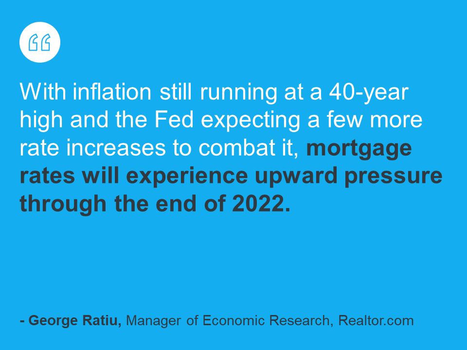 George Ratiu, manager of Economic Research at Realtor.com com explains ” With inflation still running at a 40- year high and the Fed expecting a few more rate increases to combat it, mortgage rates will experience upward pressure through the end of 2022.”