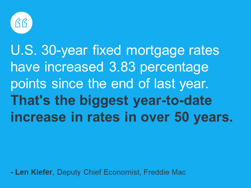Len Kiefer, Deputy Chief Economist, Freddie Mac explains “U.S. 30-year fixed mortgage rates have increased 3.83 percentage points since the end of last year. That’s the biggest year-to-date increase in rates in over 50 years.”