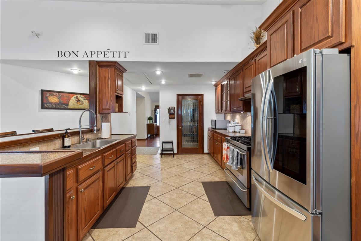 What sets this property apart is the inclusion of a 1,100-square-foot guest house. This versatile space boasts a bedroom, a bathroom, a full kitchen, a utility room, a pantry, and two open porches.
