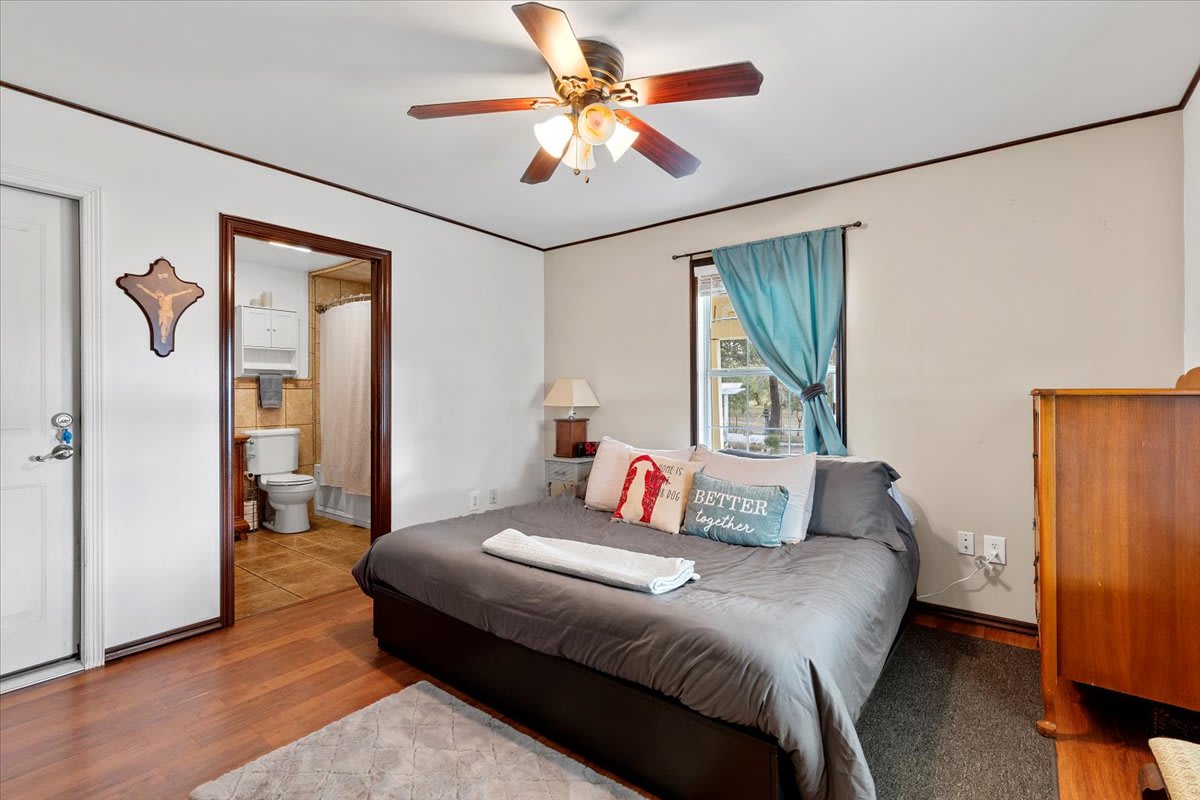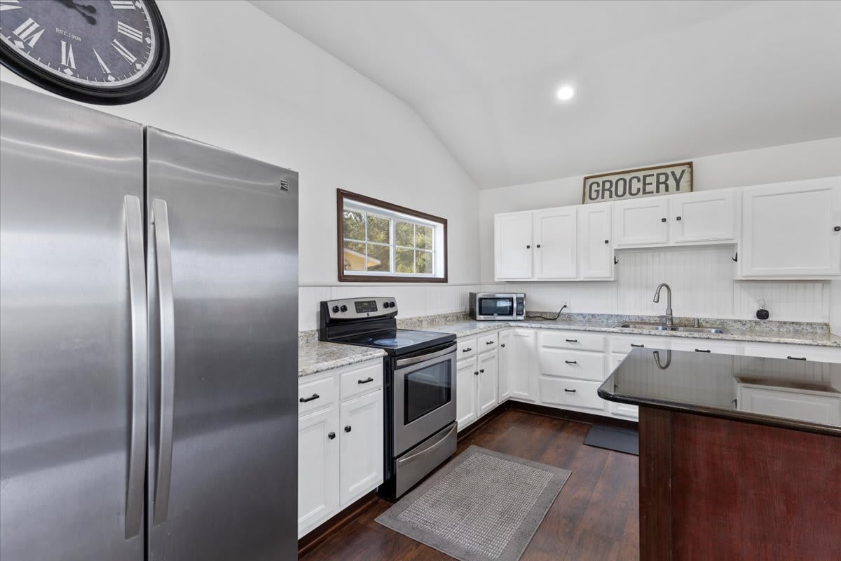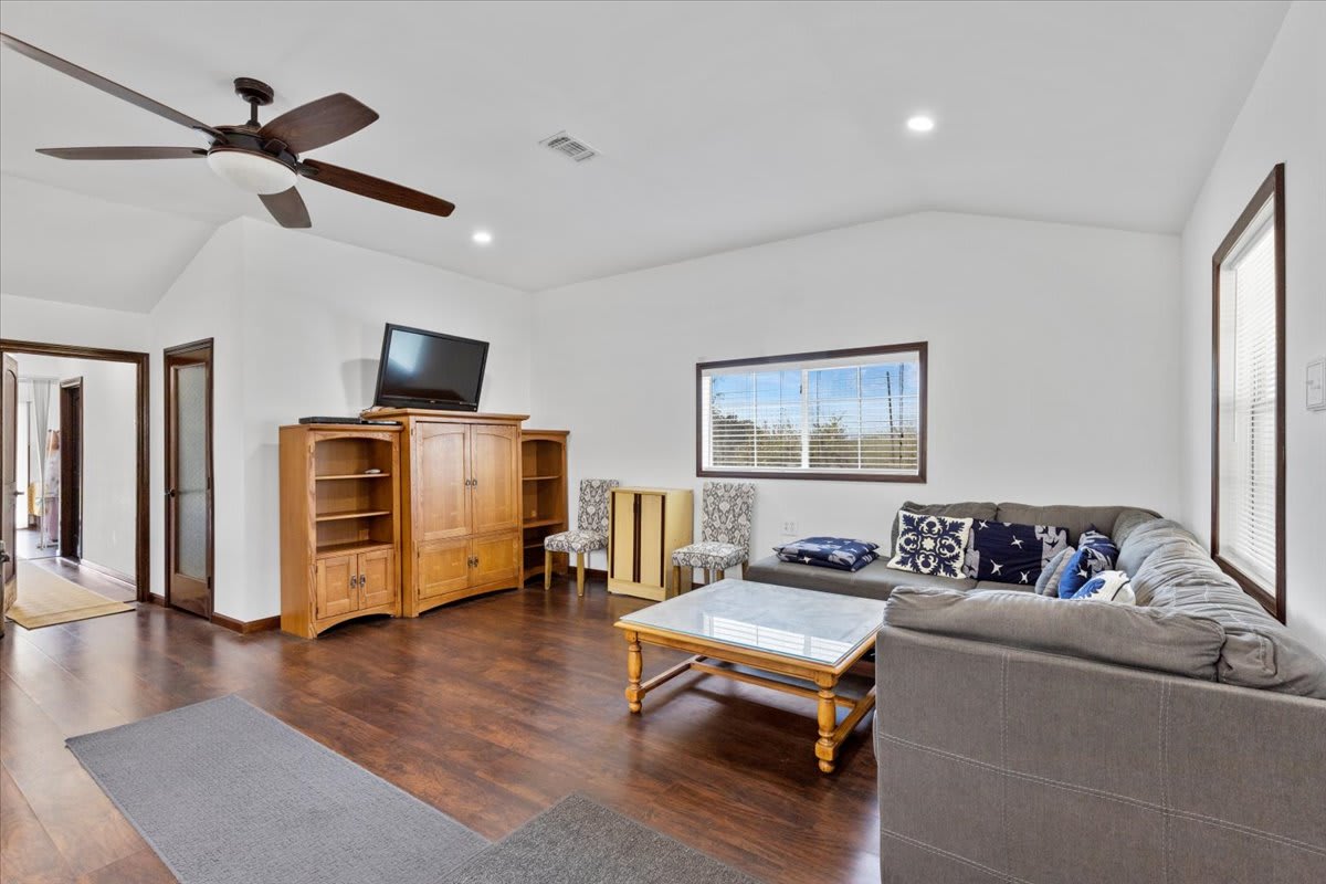 The main residence comprises three bedrooms and two bathrooms, offering 1,900 square feet of living space. As you step inside, you’ll be greeted by the inviting glow of a cozy fireplace and the elegance of wood floors. The open floor plan seamlessly flows, creating an ideal environment for both entertaining and relaxation.