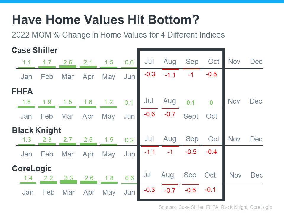 This graph represents indices reporting data from across the U.S. The data was compiled by Case Shiller, FHFA, Black Knight, and CoreLogic. Like in 2020 and 2021, home values began climbing in 2022 again as buyers continued to purchase homes, seemingly in a race to beat the rate hikes as seen in the previous graph until about June. From July through October, in almost every one of these indices, home values took a hit or gained no value as interest rates took hold of the market.