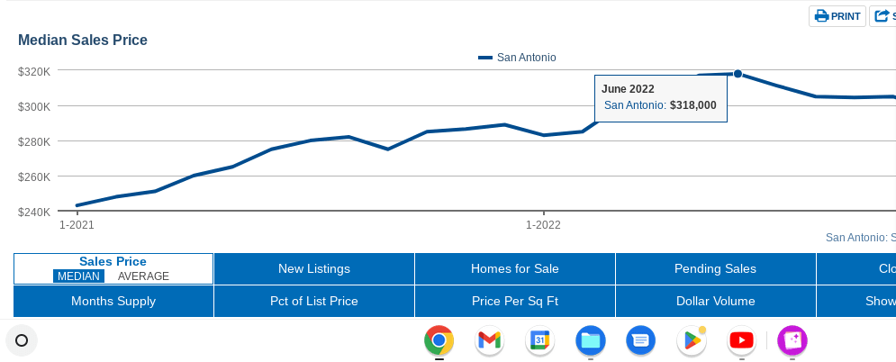 As you can see, like the average of the country, home prices in San Antonio also peeked in the May/June time frame. In May, median home prices in San Antonio were at three hundred seventeen thousand dollars and then made a small point three two percent increase through Jun and then fell a full two point one two percent in July and two percent in August.